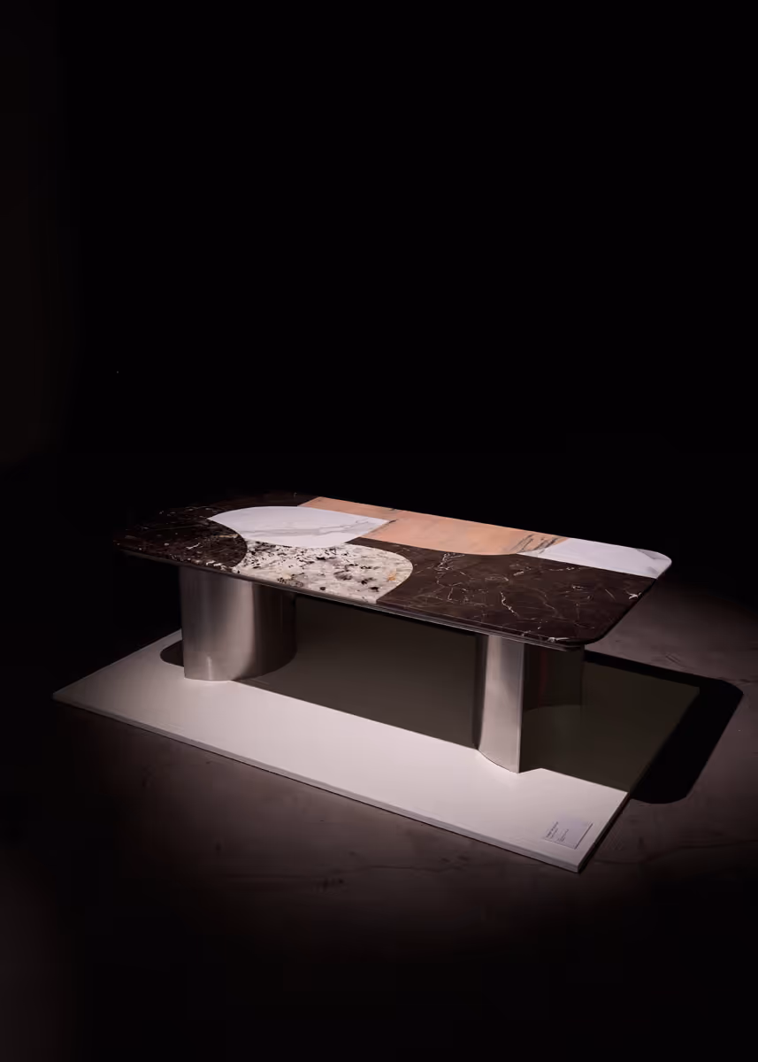 Materials from Another Realm. Multicolored marble, mirrored steel, lacquered woods, glowing finishes. Surfaces that shine, reflect, distort — as if touched by another dimension. Dark tones, bursts of light, bold lines in motion. An interplay of gloss and shadow, structure and surprise — a celebration of form without fear.