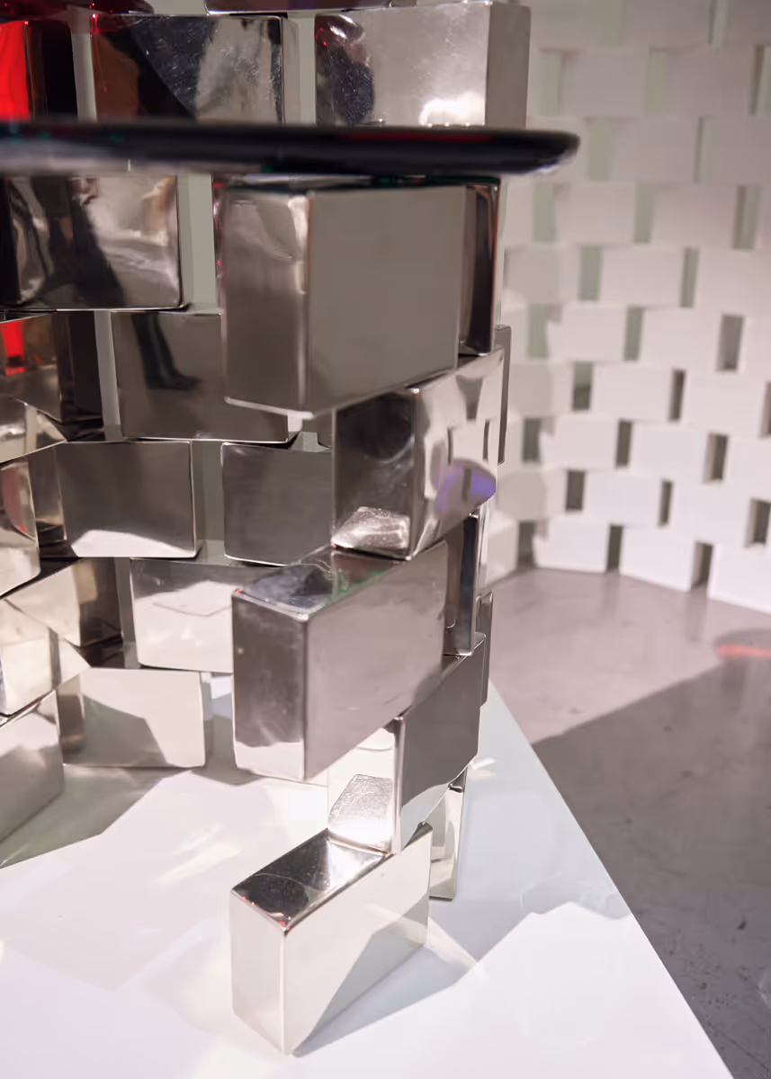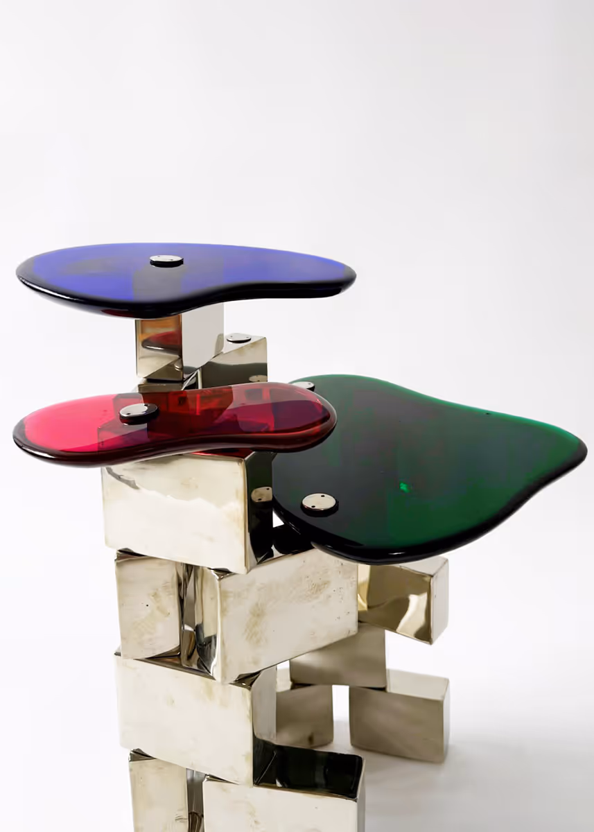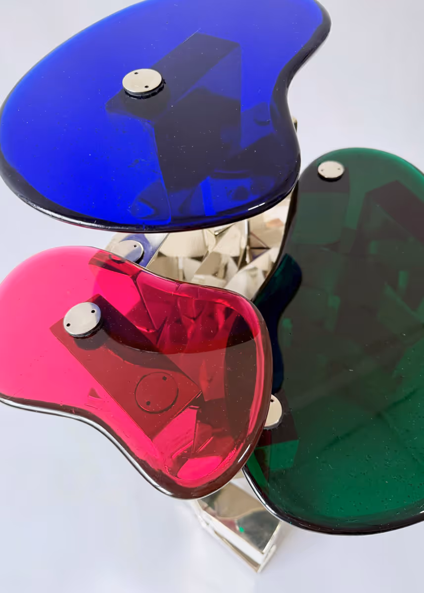 Table with alpaca base and top made of green, red, and blue cast glass.
