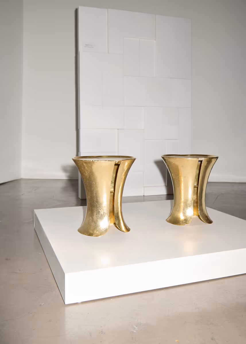 Curved single bench in cast bronze with polished finish and removable leather cushion.