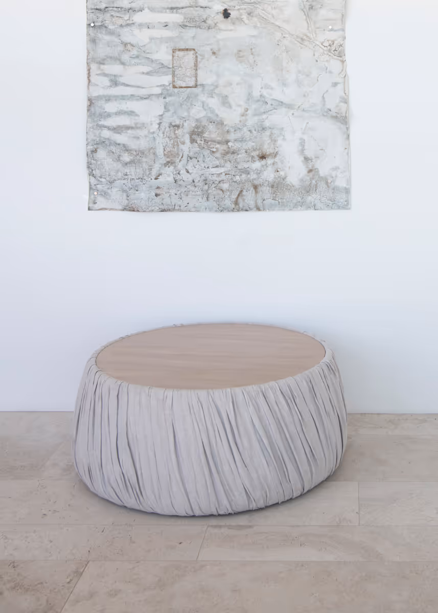 Round coffee table upholstered in gathered white leather with wooden top.