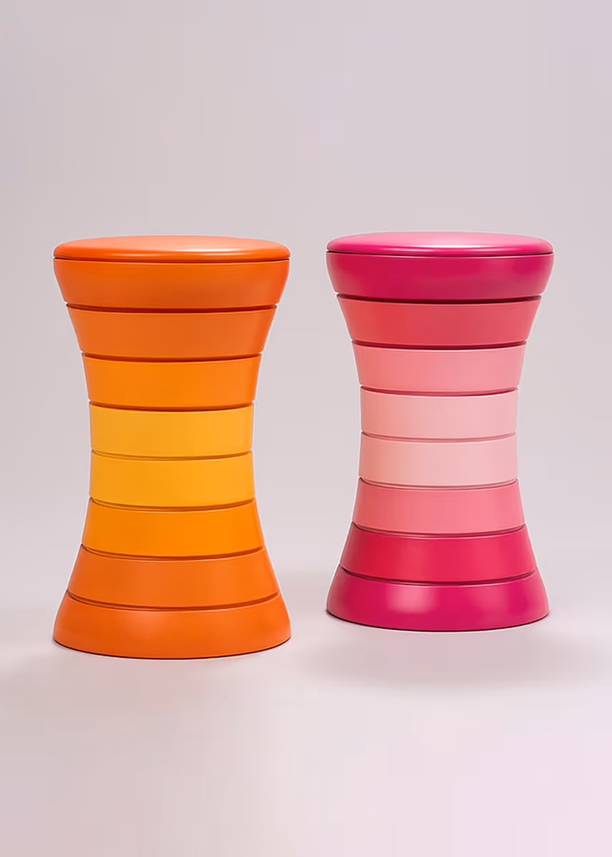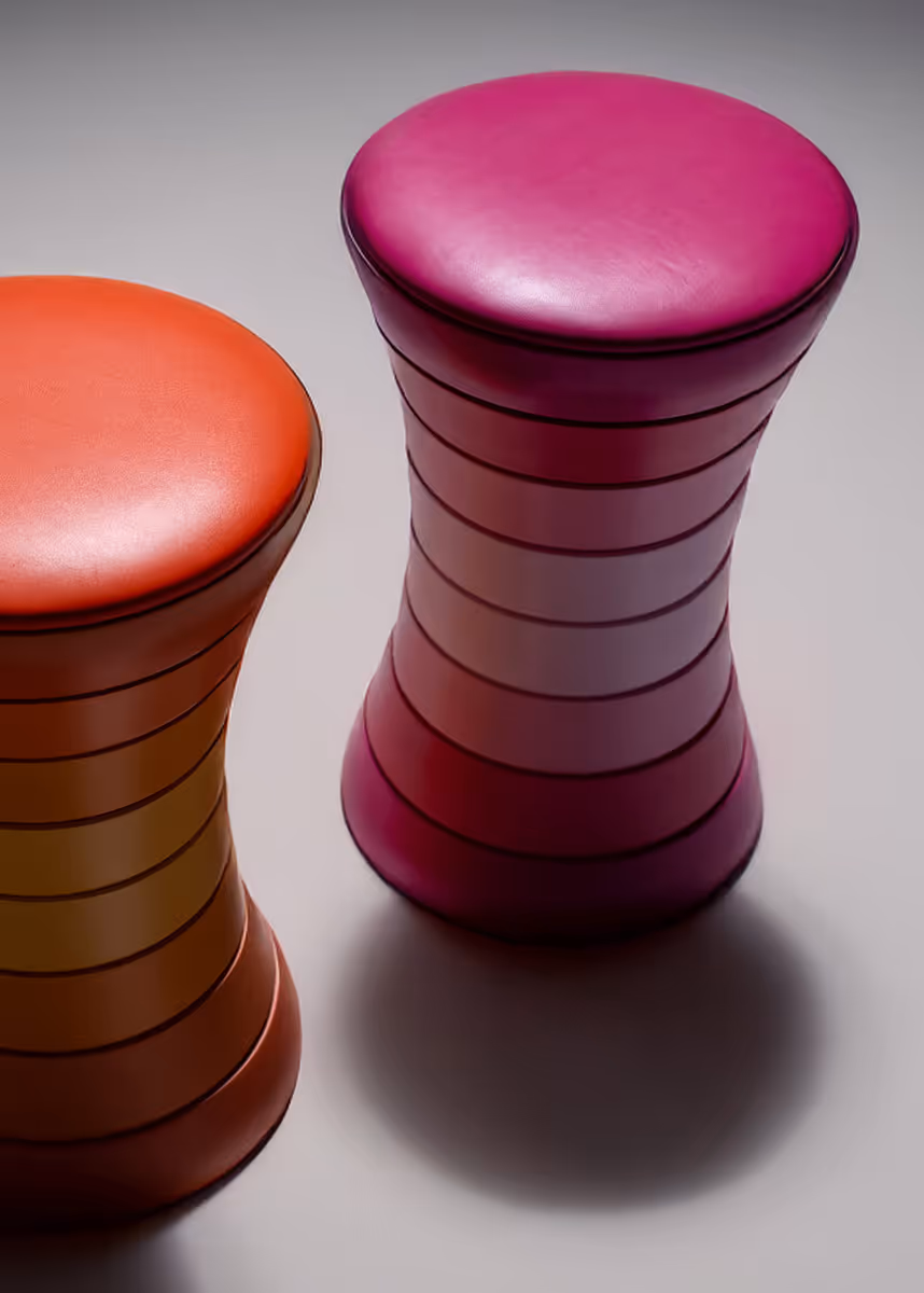Lacquered stool in vibrant colors (orange and pink) with matching leather top.